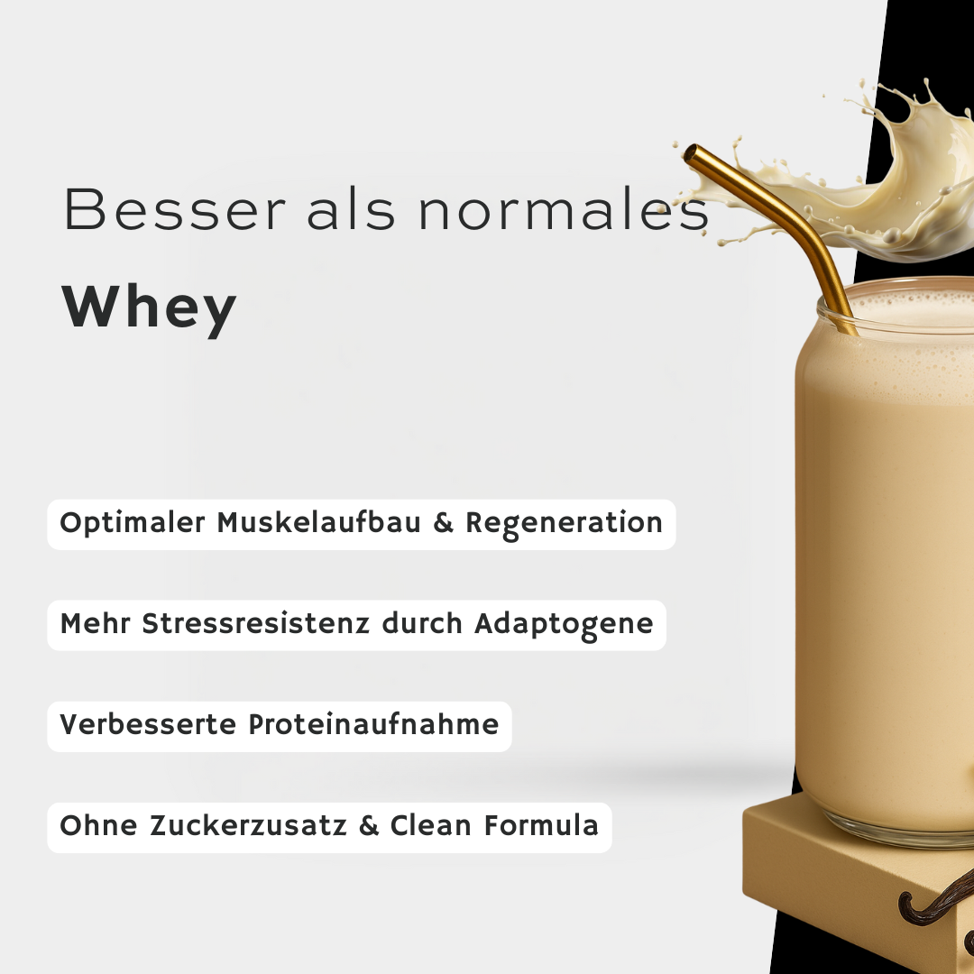 Während das Whey deine Muskeln schnell mit Eiweiß versorgt und den Aufbau sowie die Regeneration unterstützt, sorgen Adaptogene wie Lion’s Mane, Cordyceps und Chaga für mentale Klarheit, natürliche Energie und Stressresistenz.