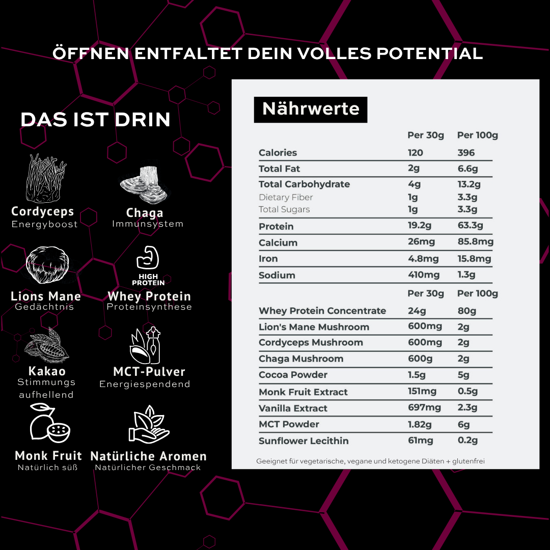 Zutaten: Whey-Protein-Konzentrat, Hericium erinaceus-Extrakt (Löwenmähne), Cordyceps Pilz-Extrakt, Chaga-Pilz-Extrakt, Kakaopulver (Bio), Siraitia grosvenorii (Mönchsfrucht-Extrakt), Scholadeextrakt, Erdbeerextrakt, MCT-Pulver, Sonnenblumenlecithin.