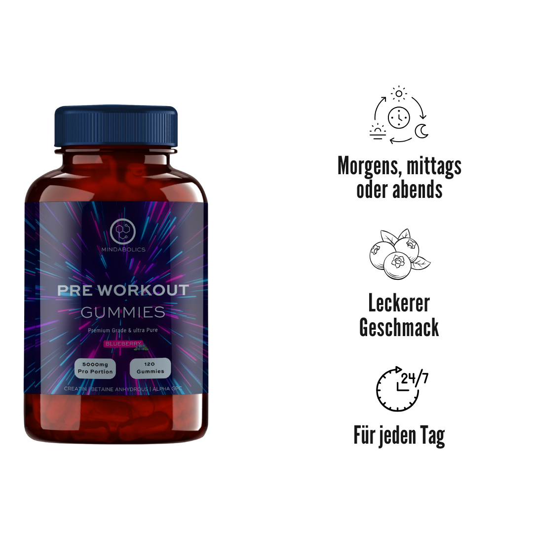 Pre-Workout Gummies sind eine praktische und leckere Möglichkeit, deine Trainingsleistung zu steigern. Diese speziell entwickelten Gummibärchen bieten eine schnelle und effektive Energiequelle, um dich vor dem Training optimal vorzubereiten. Mit einer Kombination aus leistungssteigernden Inhaltsstoffen helfen sie, deine Ausdauer zu erhöhen, die Muskelkraft zu steigern und die Regeneration zu fördern.